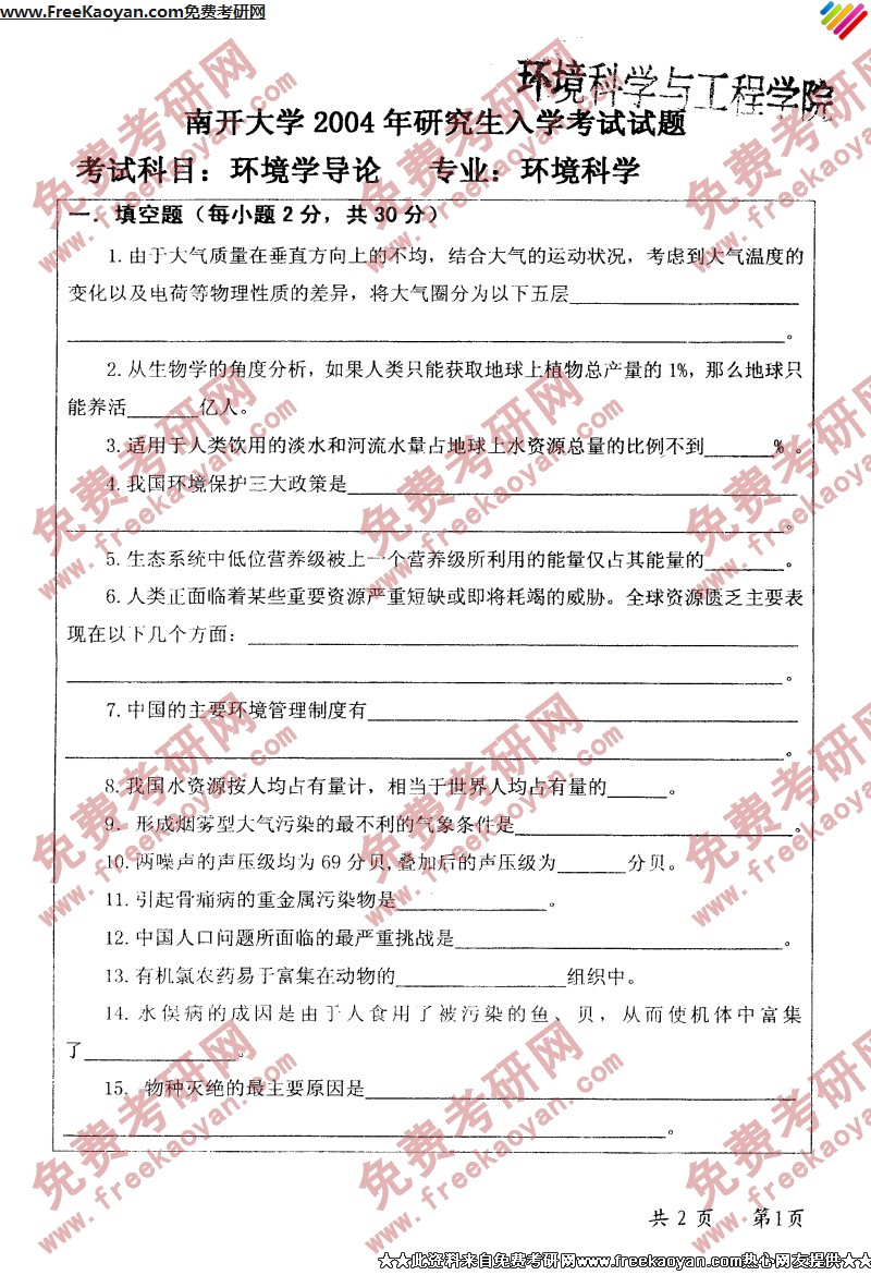 专业课考研经验 本站小编 FreeKaoyan 2018-01-23南开大学2004年考研真题-环境管理