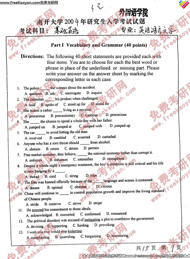 专业课考研经验 本站小编 FreeKaoyan 2018-01-23南开大学2004年考研真题-汉语翻译与文学