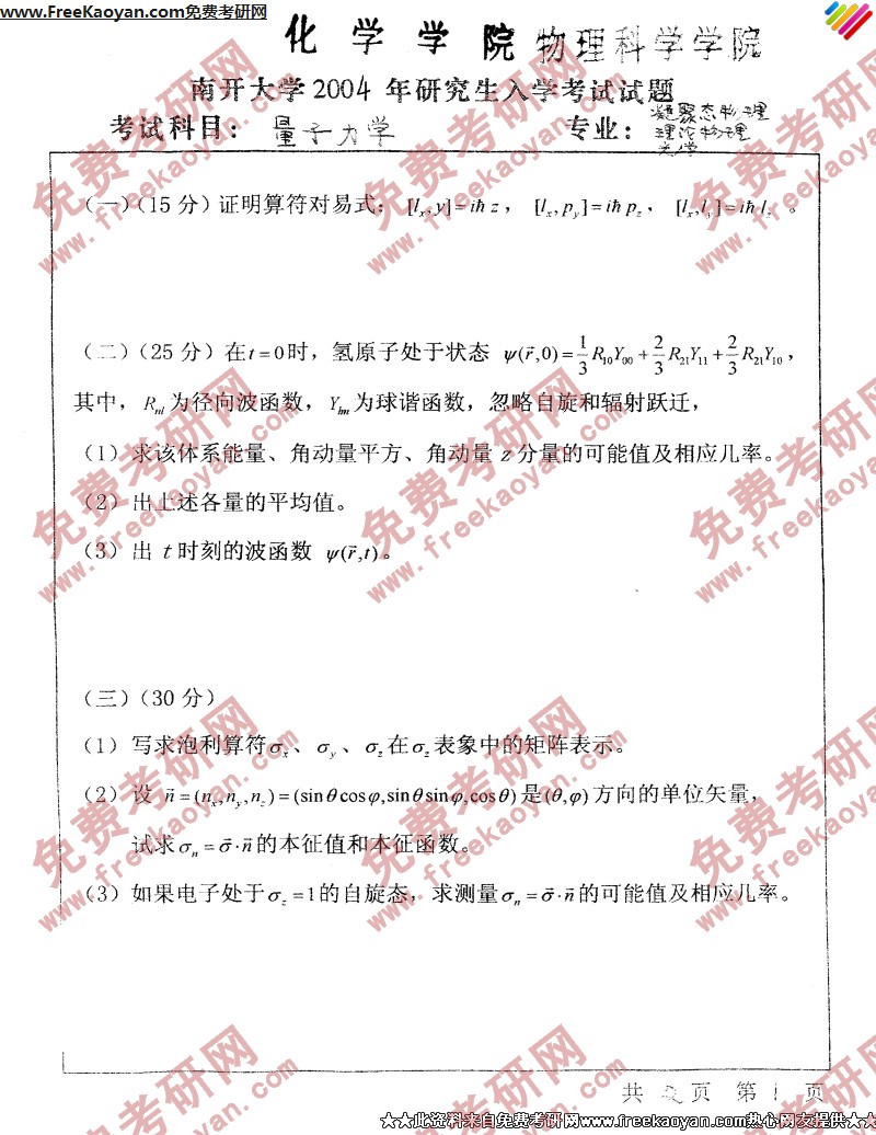 专业课考研经验 本站小编 FreeKaoyan 2018-01-23南开大学2004年考研真题-环境化学与分析化学