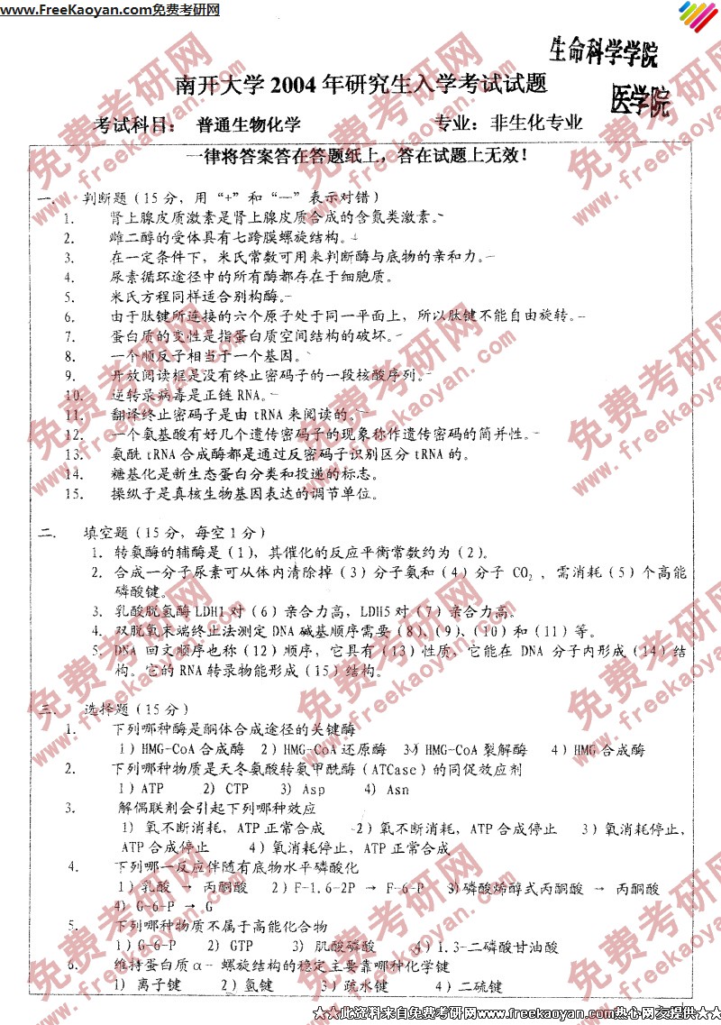 南开大学2004年考研真题-普通生物化学
