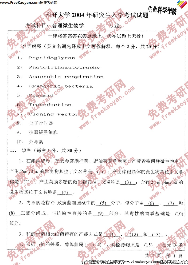 专业课考研经验 本站小编 FreeKaoyan 2018-01-23南开大学2004年考研真题-普通生物化学