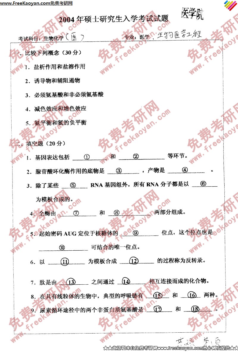 南开大学2004年考研真题-生物化学(医)