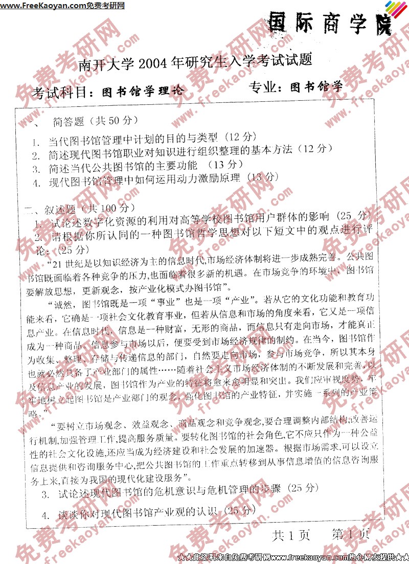 南开大学2004年考研真题-图书馆学理论