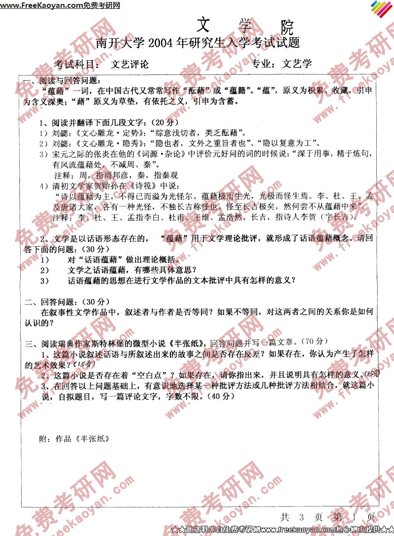 专业课考研经验 本站小编 FreeKaoyan 2018-01-23南开大学2004年考研真题-世界文学
