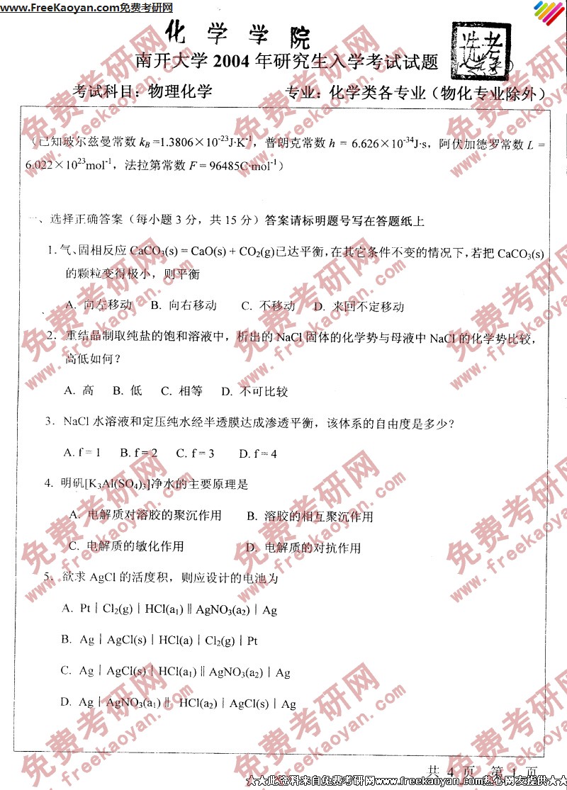 专业课考研经验 本站小编 FreeKaoyan 2018-01-23南开大学2004年考研真题-无机化学(非无机化学专业)