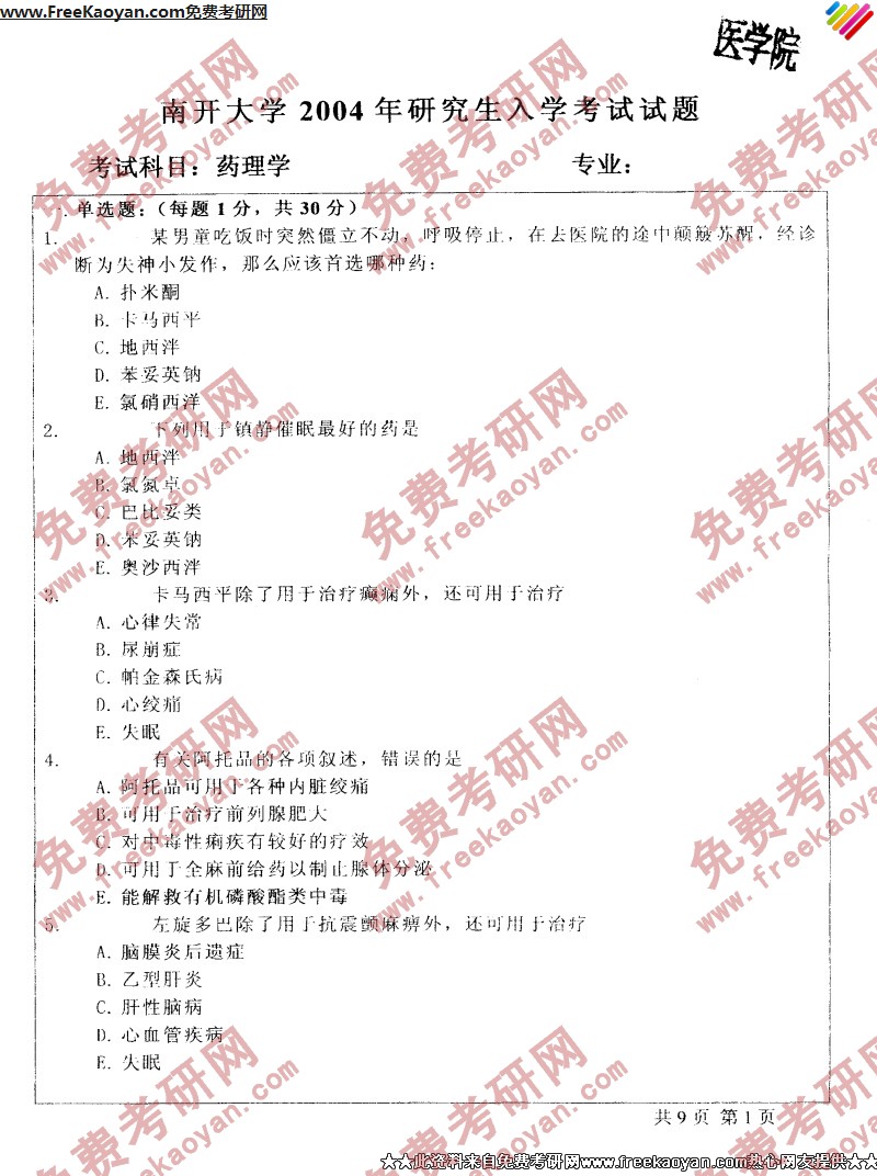 专业课考研经验 本站小编 FreeKaoyan 2018-01-23南开大学2004年考研真题-物理化学(物理化学专业)