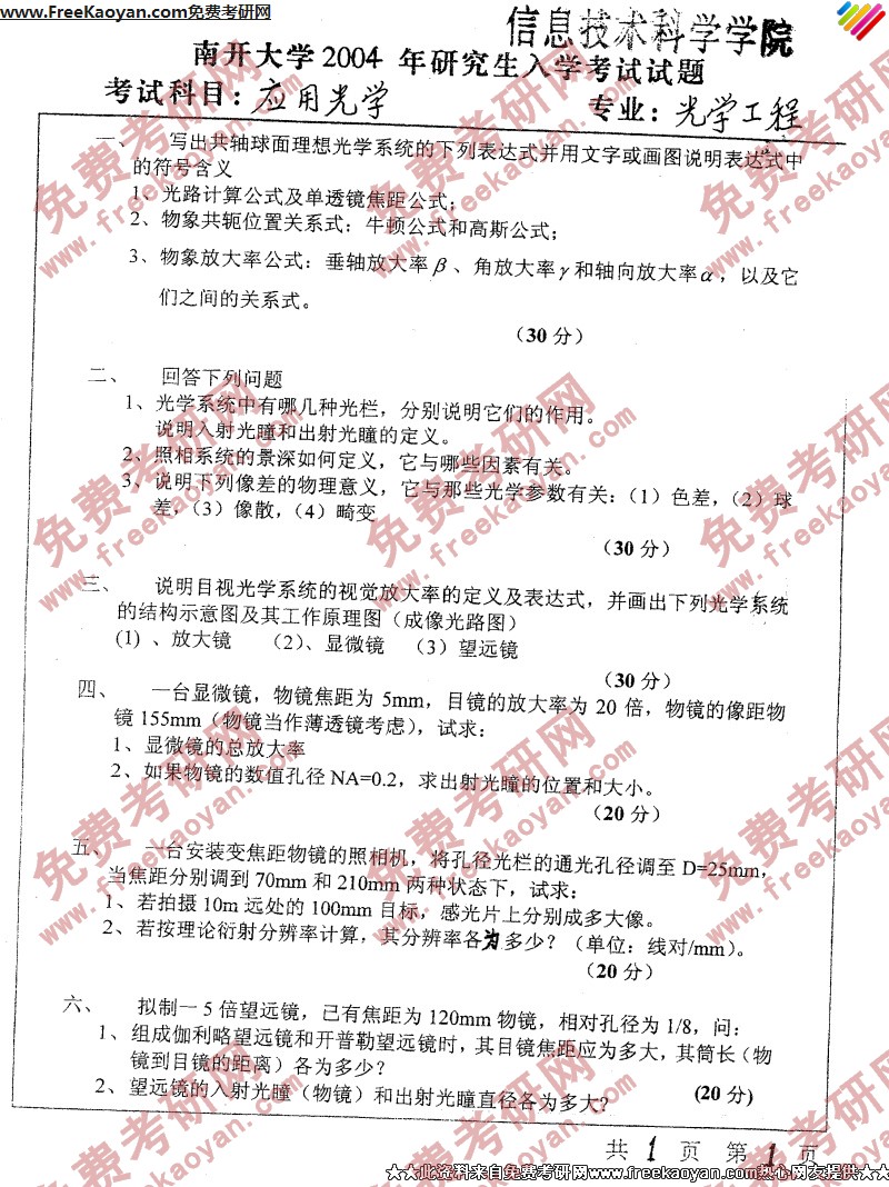 专业课考研经验 本站小编 FreeKaoyan 2018-01-23南开大学2004年考研真题-信息科学技术学院综合基础