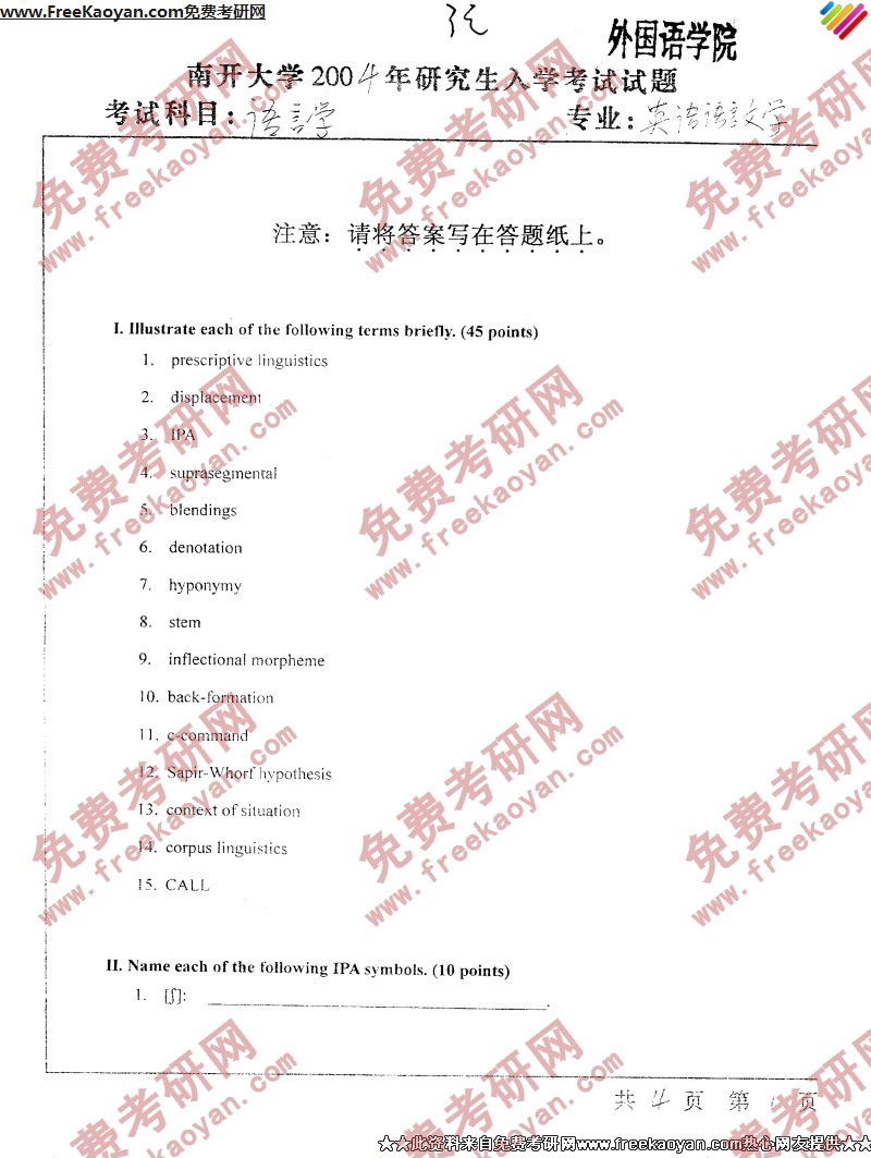 相关话题/南开大学 考研真题 语言学