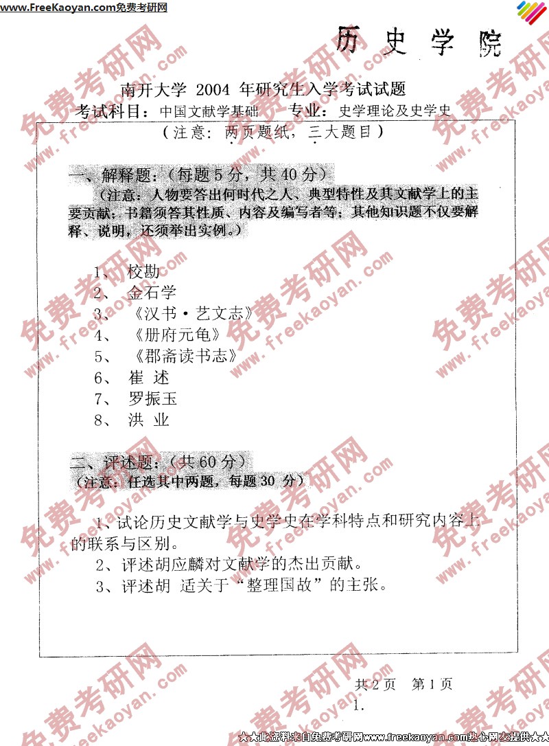 专业课考研经验 本站小编 FreeKaoyan 2018-01-23南开大学2004年考研真题-中国史学是与史学理论