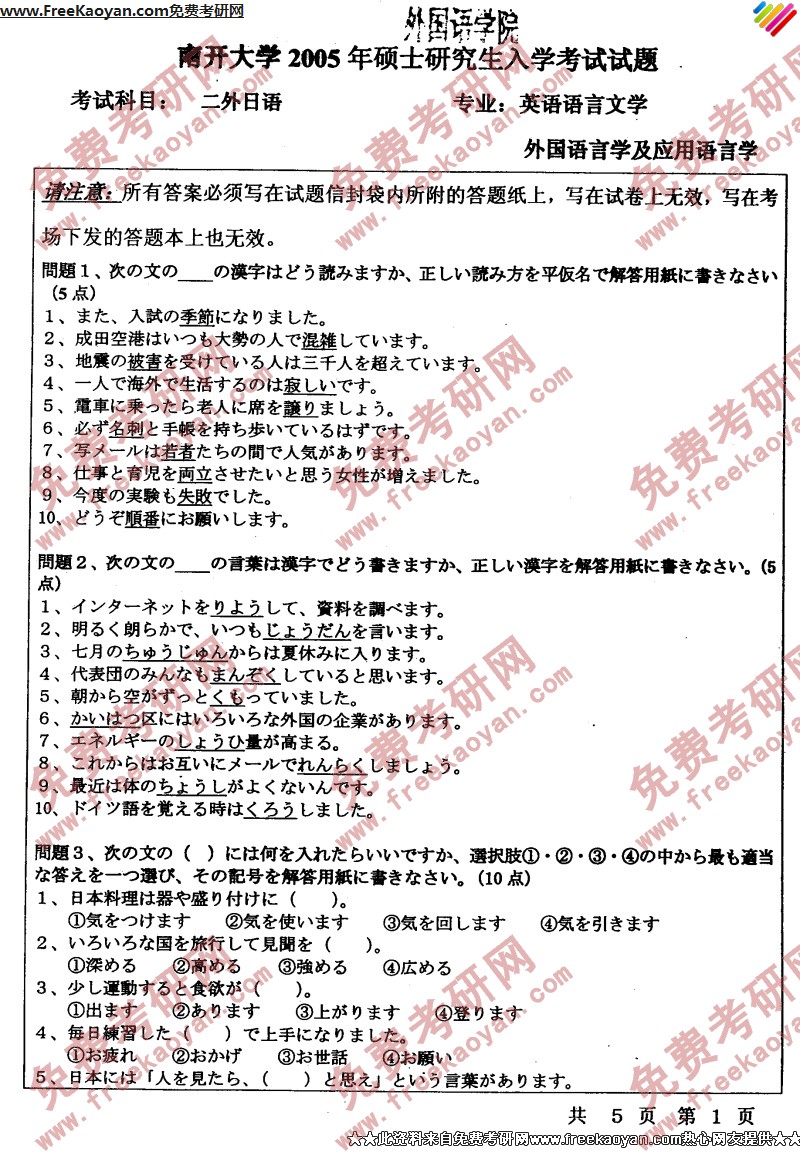 南开大学2005年考研真题-二外日语