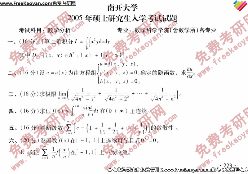 专业课考研经验 本站小编 FreeKaoyan 2018-01-23南开大学2005年考研真题-高等数学(光学)