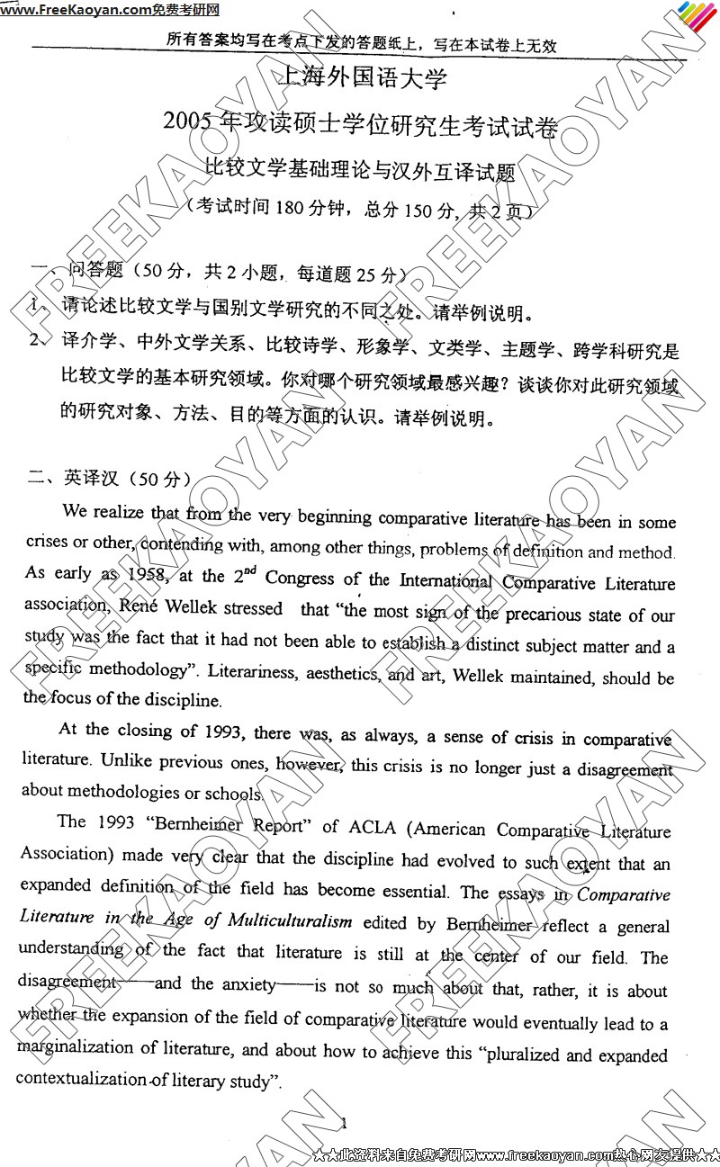 上海外国语大学2005年考研真题-比较文学基础理论与汉外互译