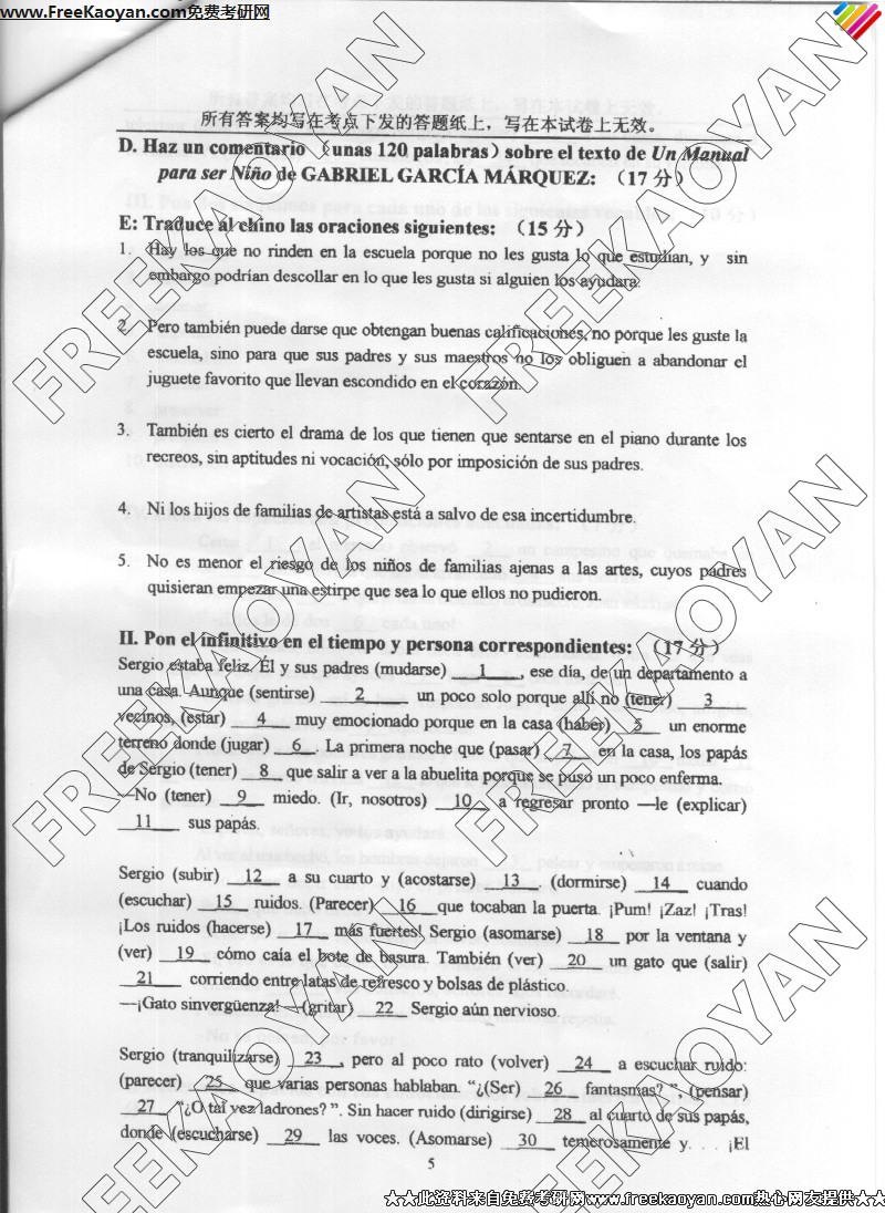上海外国语大学2005年考研真题-西班牙语言文学专业综合考试(5)
