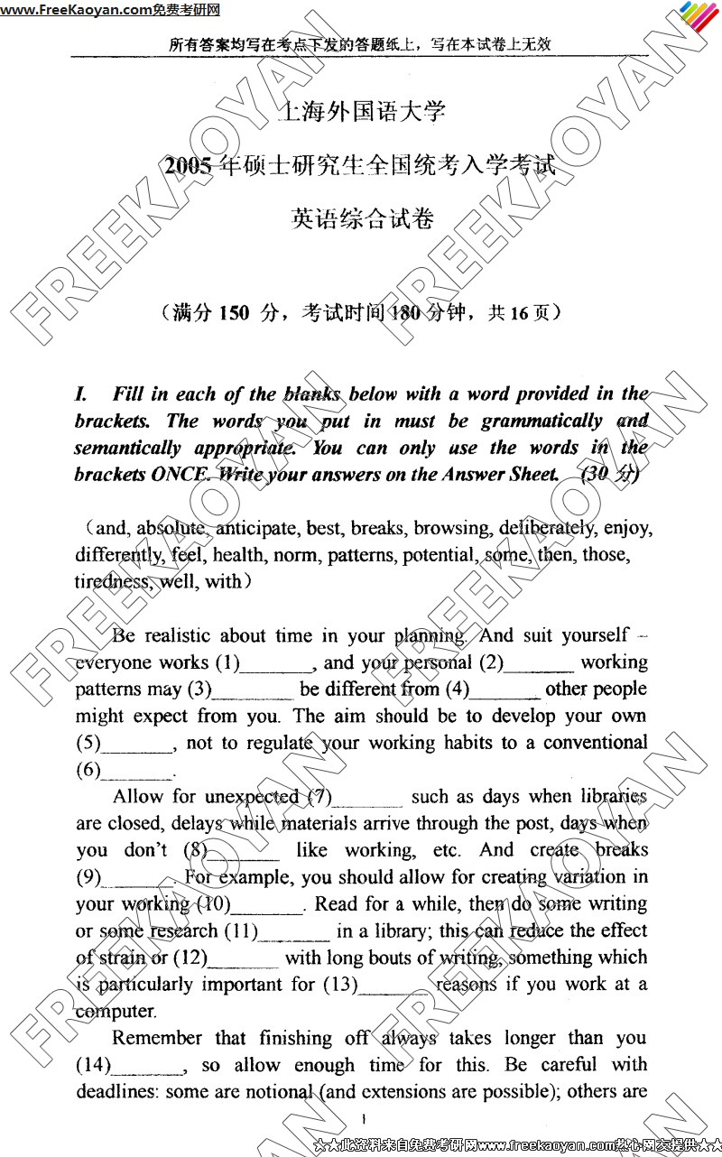 专业课考研经验 本站小编 FreeKaoyan 2018-01-23上海外国语大学2005年考研真题-英语综合及答案