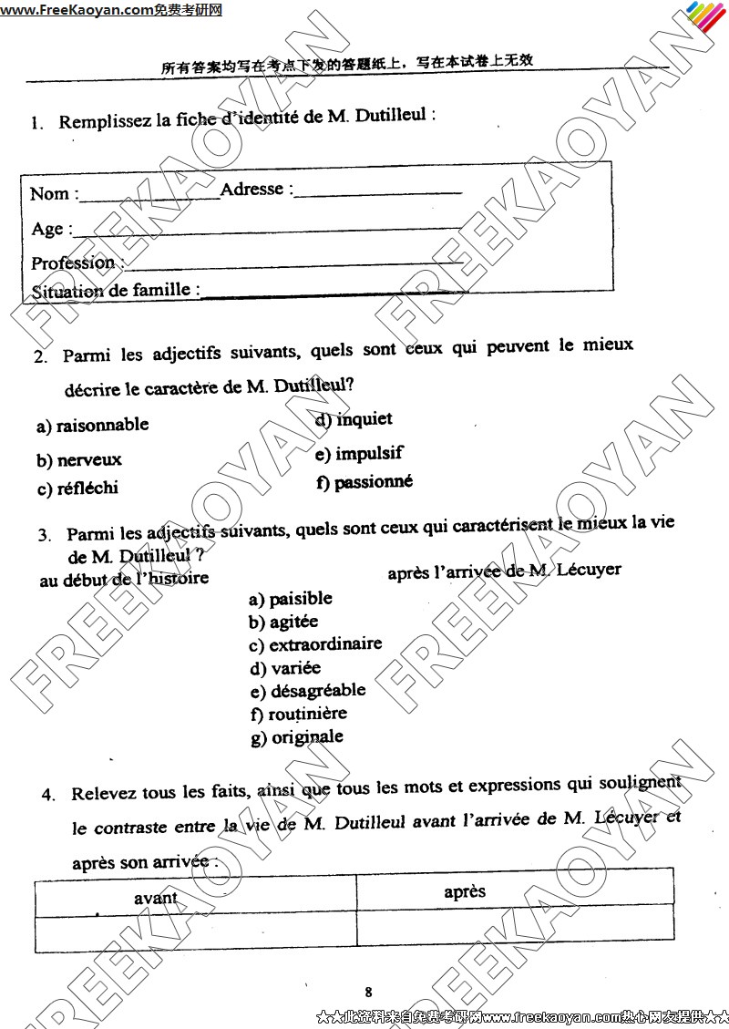 上海外国语大学2005年考研真题-综合考试(法语语言文学)(8)