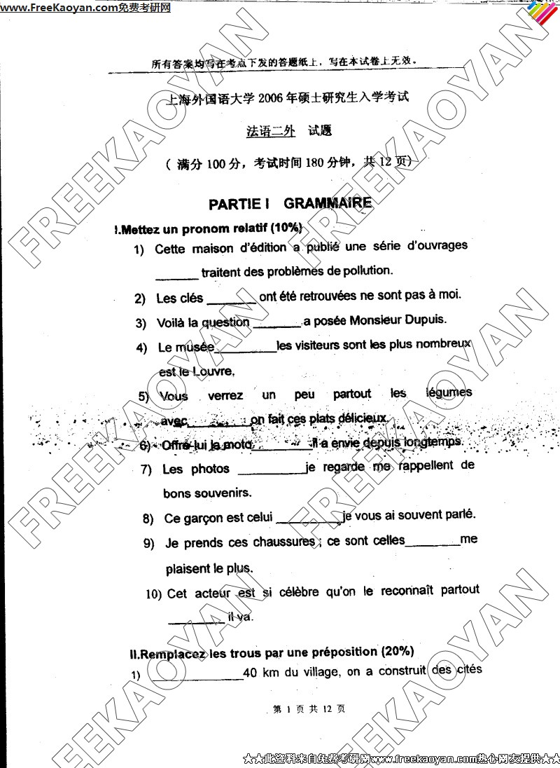 专业课考研经验 本站小编 FreeKaoyan 2018-01-23上海外国语大学2005年考研真题-综合考试(法语语言文学)