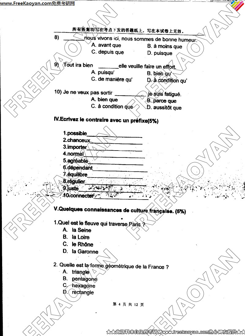 专业课考研经验 本站小编 FreeKaoyan 2018-01-23上海外国语大学2005年考研真题-综合考试(法语语言文学)