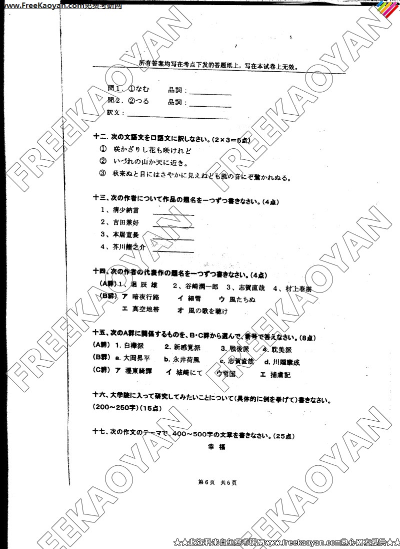 专业课考研经验 本站小编 FreeKaoyan 2018-01-23上海外国语大学2006年考研真题-日汉互译