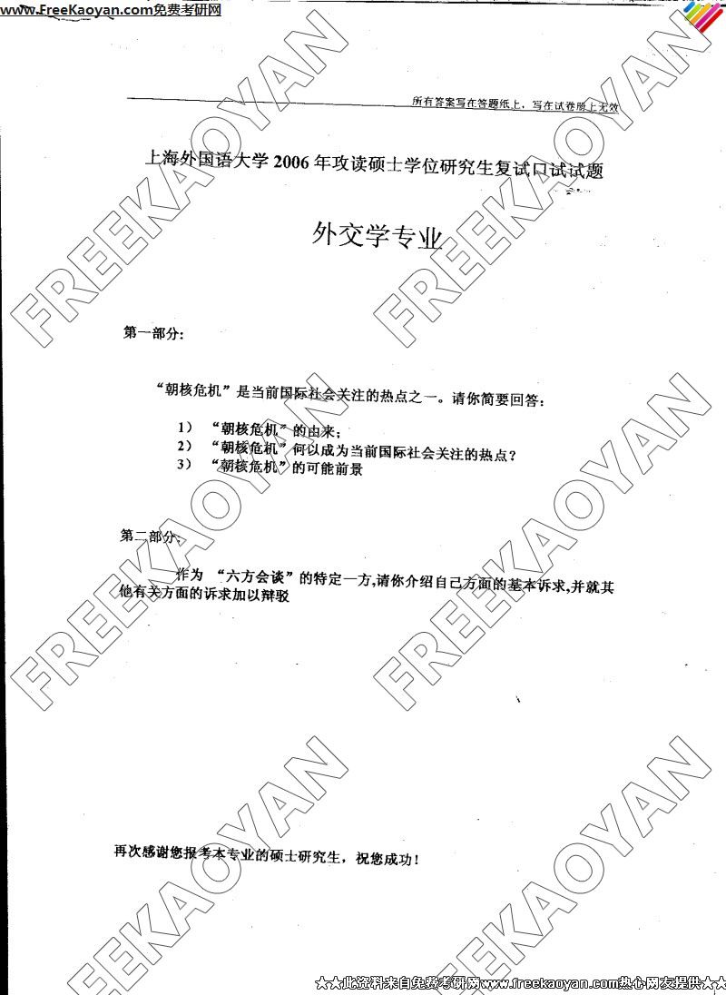 专业课考研经验 本站小编 FreeKaoyan 2018-01-23上海外国语大学2006年考研真题-国际关系复试