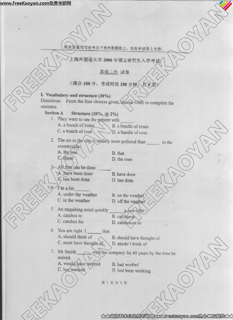 专业课考研经验 本站小编 FreeKaoyan 2018-01-23上海外国语大学2006年考研真题-日语二外
