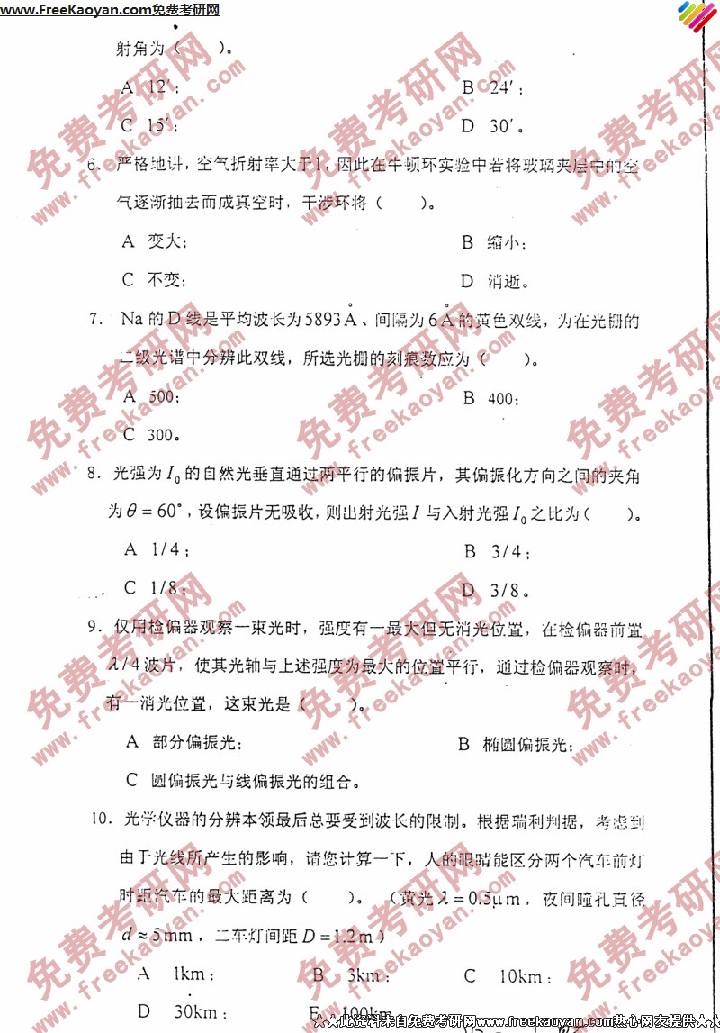 西安交通大学2005年考研真题-光学(2)