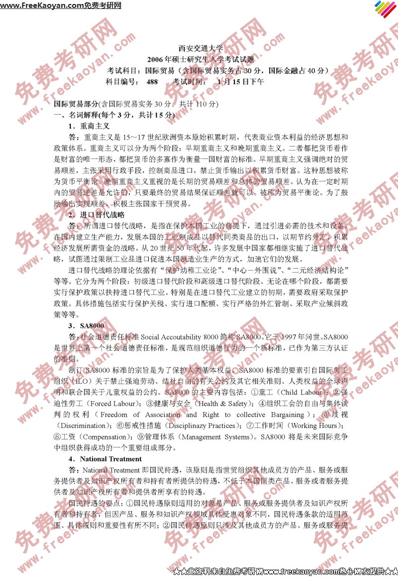 西安交通大学2006年考研真题-国际贸易及答案