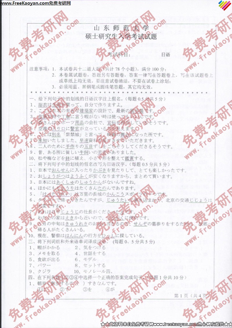 专业课考研经验 本站小编 FreeKaoyan 2018-01-23山东师范大学2007年考研真题-基础日语