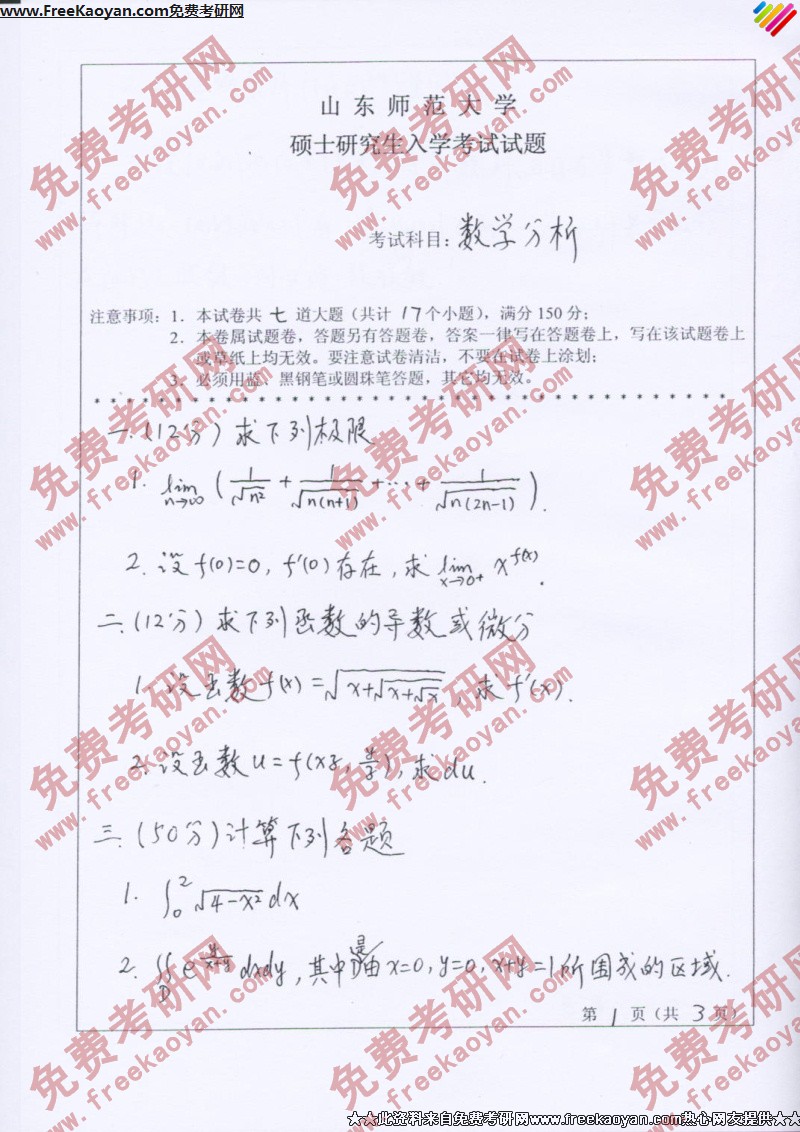 专业课考研经验 本站小编 FreeKaoyan 2018-01-23山东师范大学2007年考研真题-高等数学B