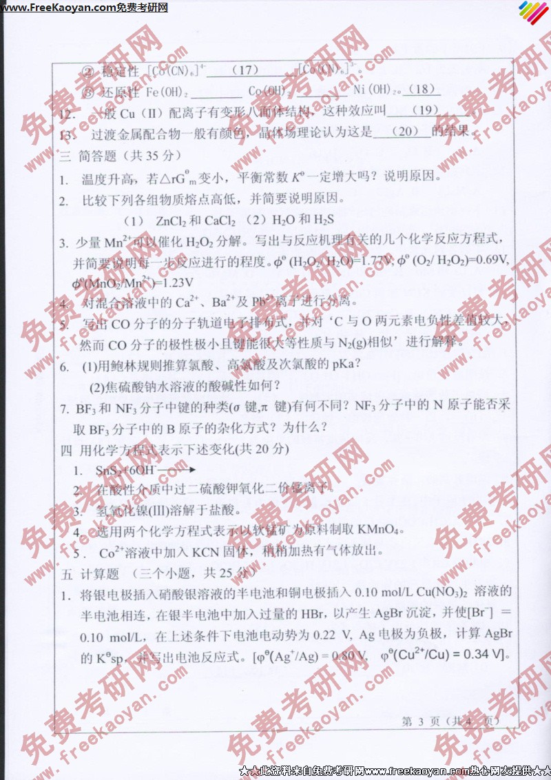 山东师范大学2007年考研真题-无机化学(3)