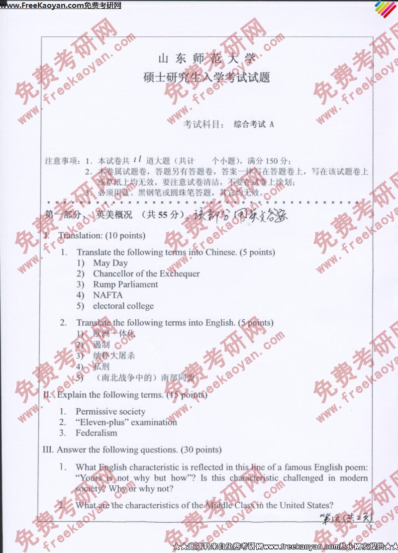 专业课考研经验 本站小编 FreeKaoyan 2018-01-23山东师范大学2007年考研真题-英语