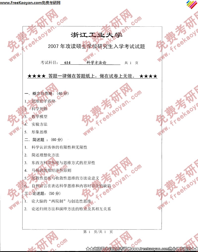 浙江工业大学2007年考研真题-科学方法论