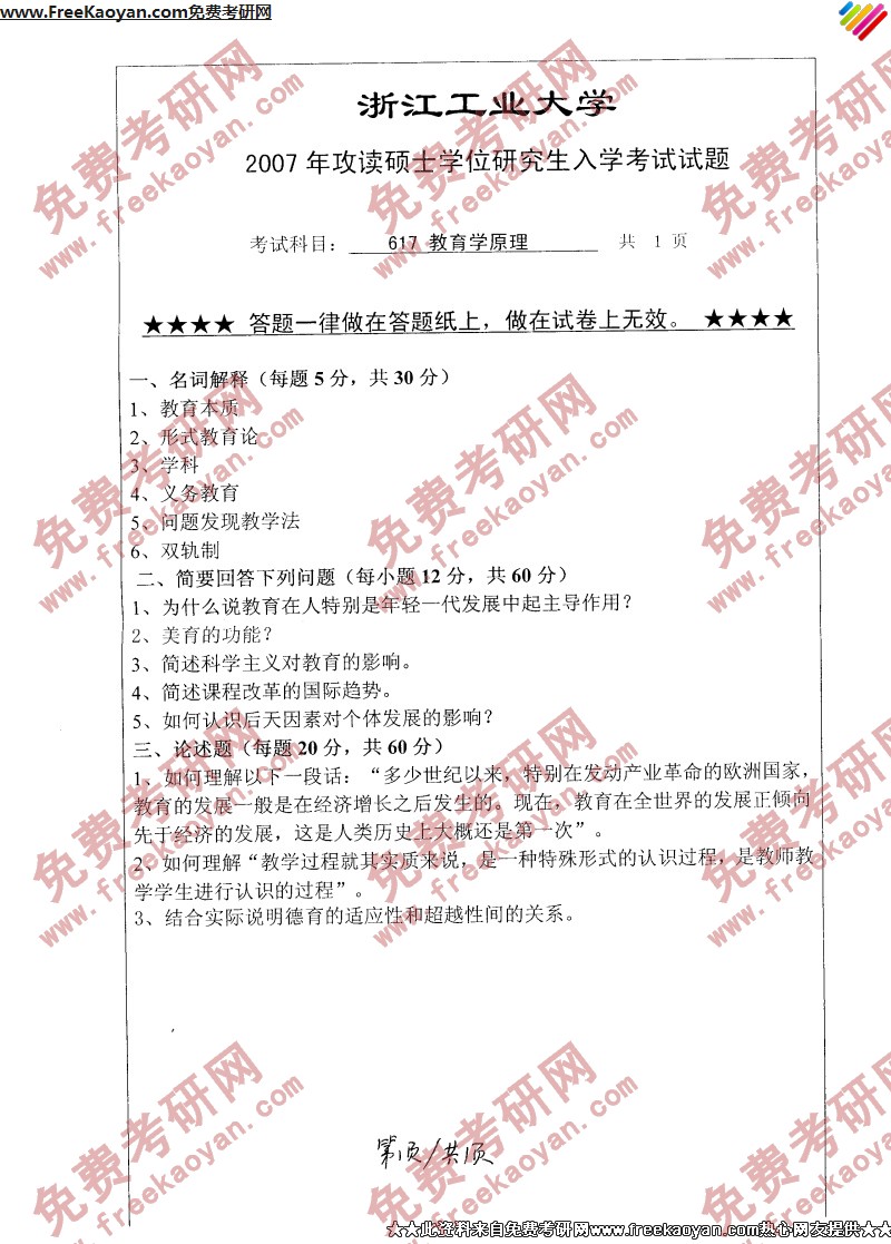 浙江工业大学2007年考研真题-教育学原理