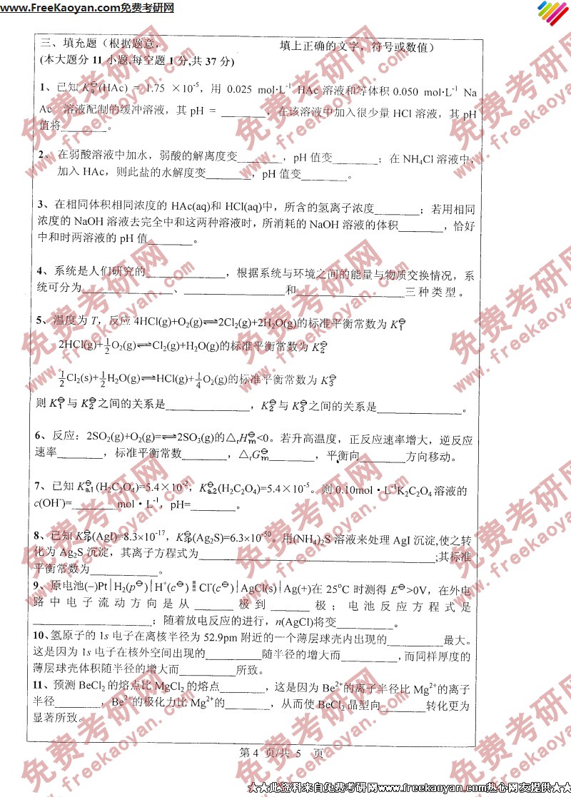 专业课考研经验 本站小编 FreeKaoyan 2018-01-23浙江工业大学2007年考研真题-物理化学