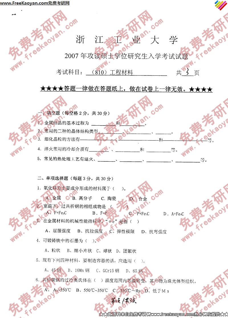 专业课考研经验 本站小编 FreeKaoyan 2018-01-23浙江工业大学2007年考研真题-物理化学
