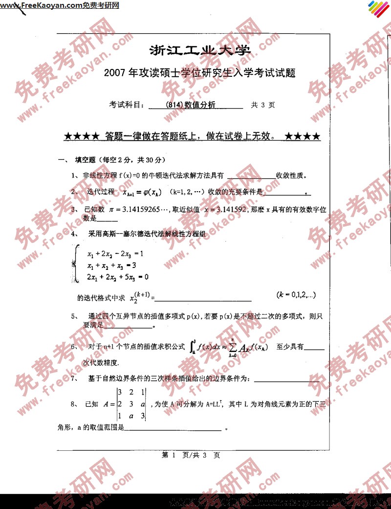 专业课考研经验 本站小编 FreeKaoyan 2018-01-23浙江工业大学2007年考研真题-高等数学