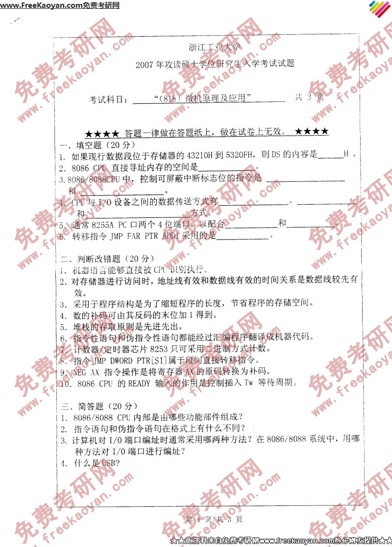 专业课考研经验 本站小编 FreeKaoyan 2018-01-23浙江工业大学2007年考研真题-微机原理