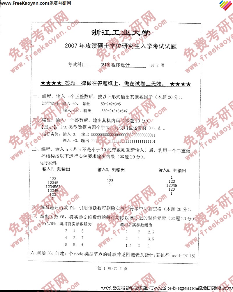 浙江工业大学2007年考研真题-程序设计
