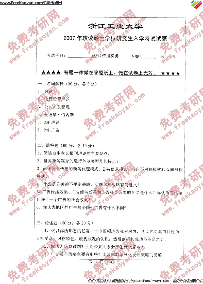 浙江工业大学2007年考研真题-传播实务