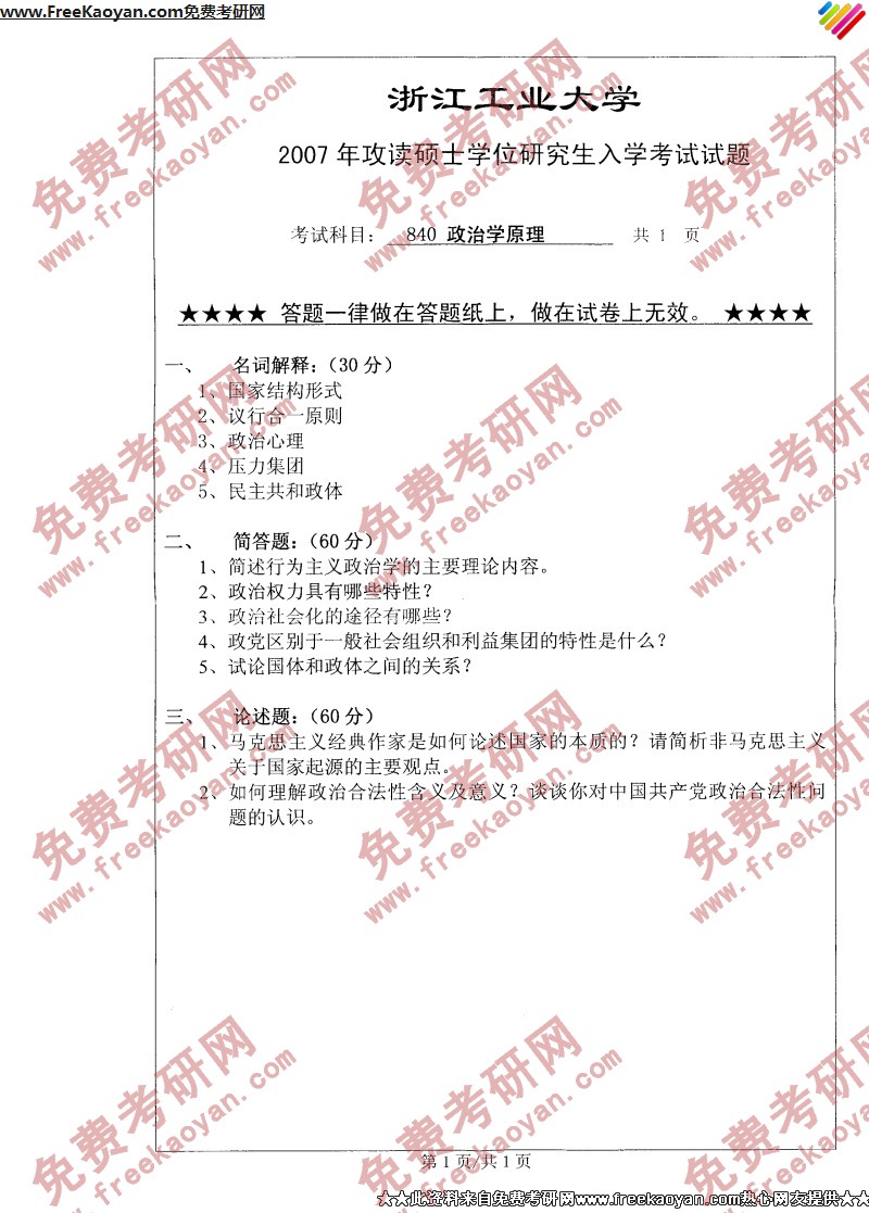 专业课考研经验 本站小编 FreeKaoyan 2018-01-23浙江工业大学2007年考研真题-科学技术法学