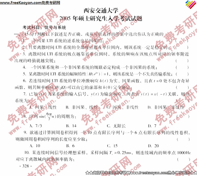 西安交通大学2005年考研真题-信号与系统