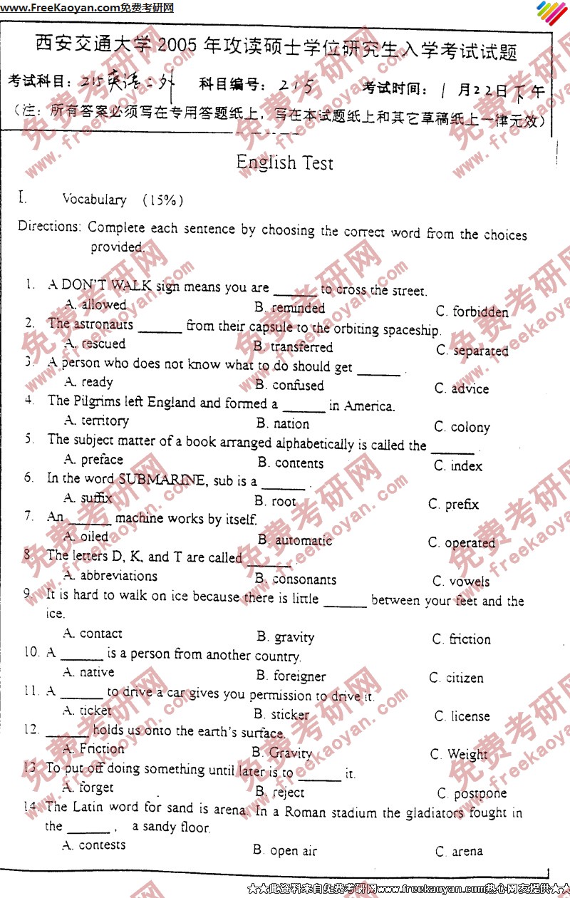 专业课考研经验 本站小编 FreeKaoyan 2018-01-23西安交通大学2005年考研真题-卫生综合