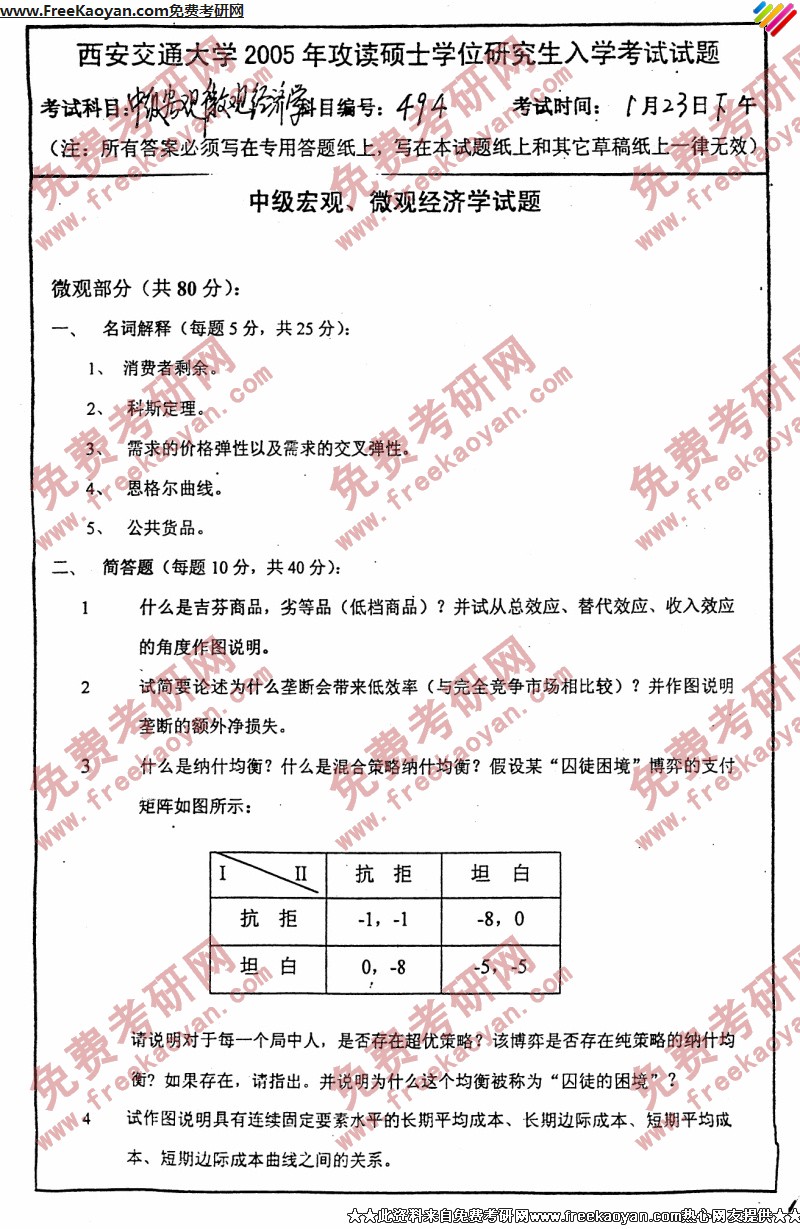西安交通大学2005年考研真题-中级宏观微观经济学