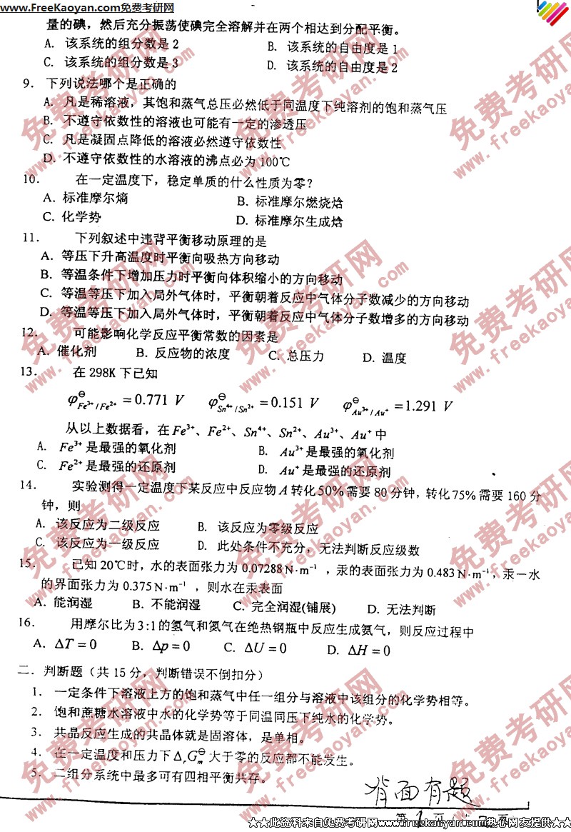 专业课考研经验 本站小编 FreeKaoyan 2018-01-23西安交通大学2005年考研真题-化工原理