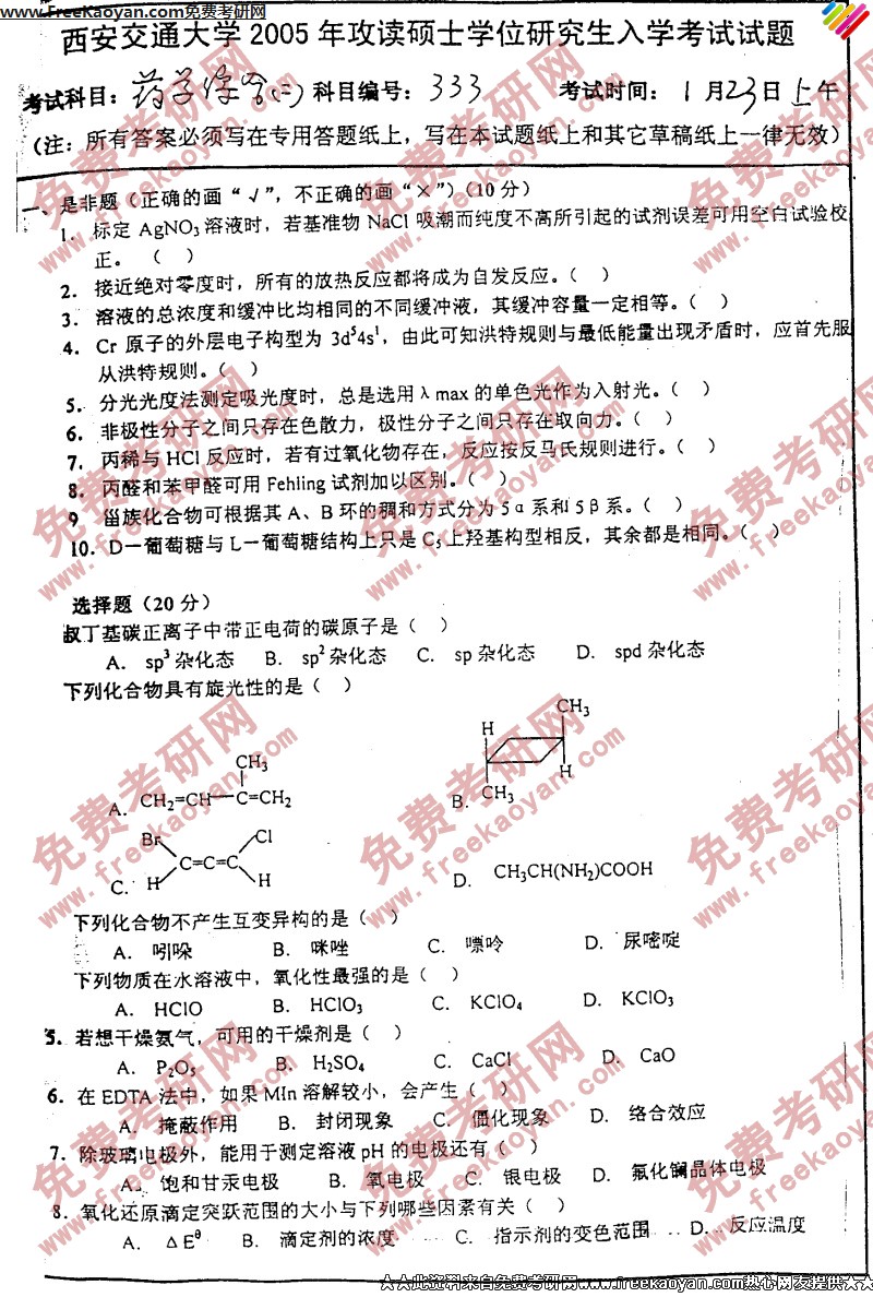专业课考研经验 本站小编 FreeKaoyan 2018-01-23西安交通大学2005年考研真题-物理化学