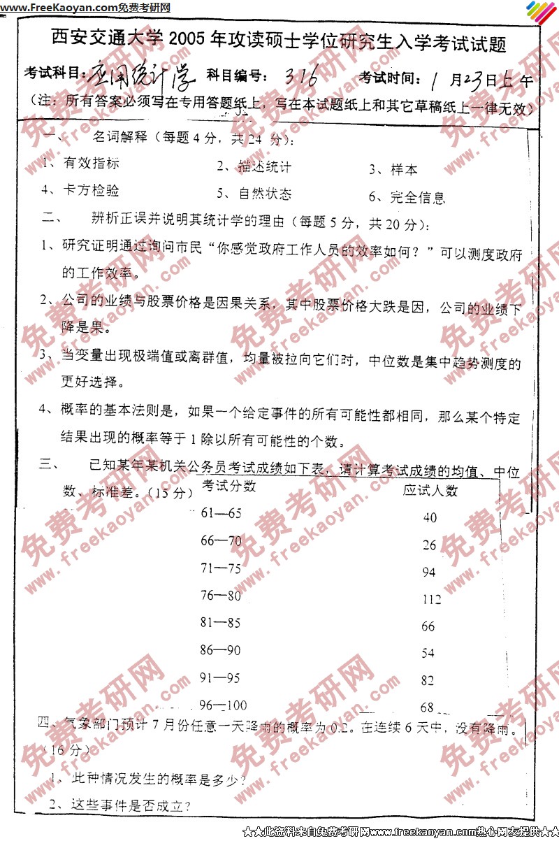 专业课考研经验 本站小编 FreeKaoyan 2018-01-23西安交通大学2005年考研真题-统计学