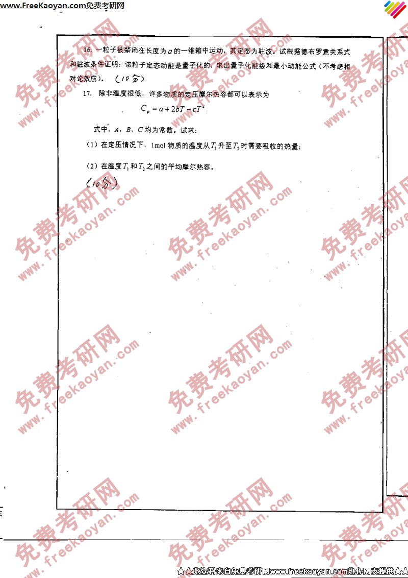 专业课考研经验 本站小编 FreeKaoyan 2018-01-23西安交通大学2005年考研真题-物理化学