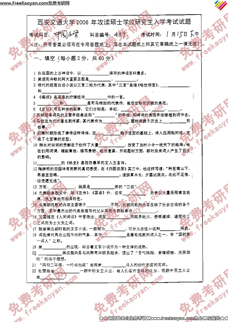 西安交通大学2006年考研真题-中国文学