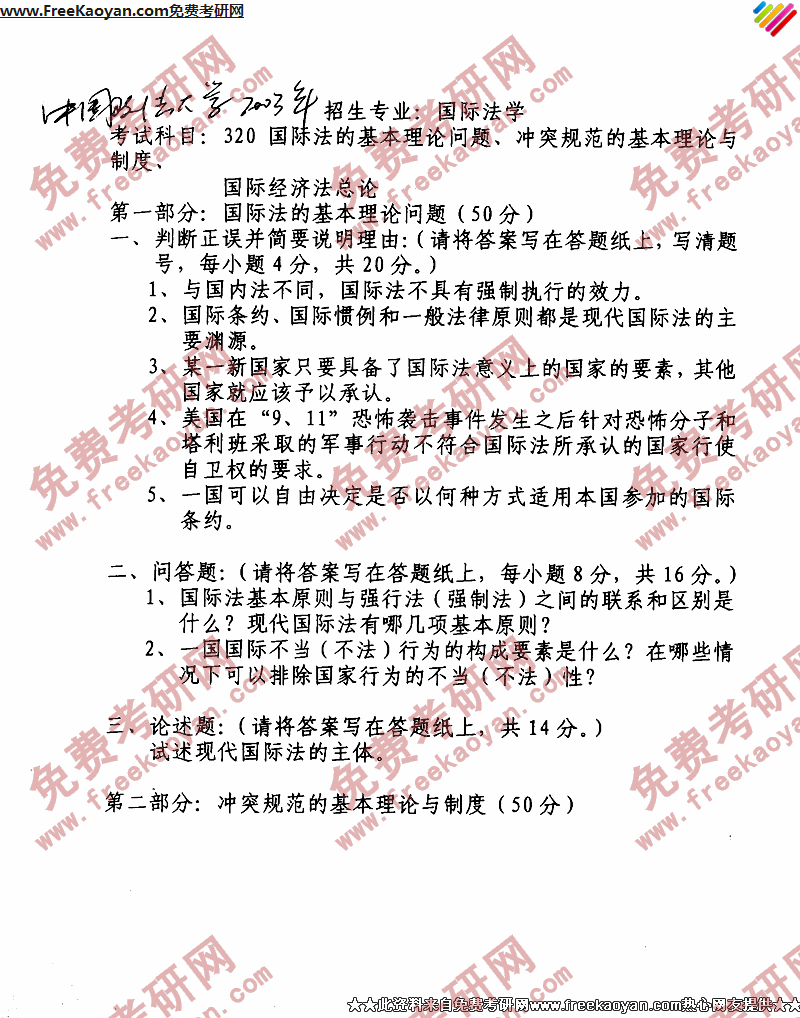 中国政法大学2003年考研真题-国际法的基本理论问题、冲突规范的基本理论与制度、国际经济法总论国际法的基本理论问题、冲突规范的基本理论与制度、国际经济法总论