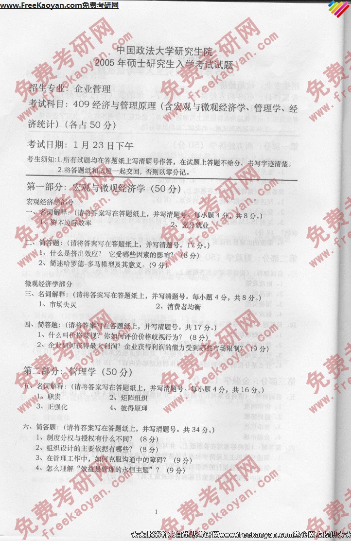 专业课考研经验 本站小编 FreeKaoyan 2018-01-23中国政法大学2005年考研真题-管理学、行政学