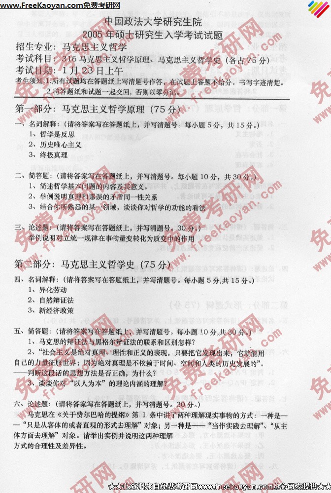 专业课考研经验 本站小编 FreeKaoyan 2018-01-23中国政法大学2005年考研真题-辨证唯物主义认识论、自然辨证法、现代西方哲学